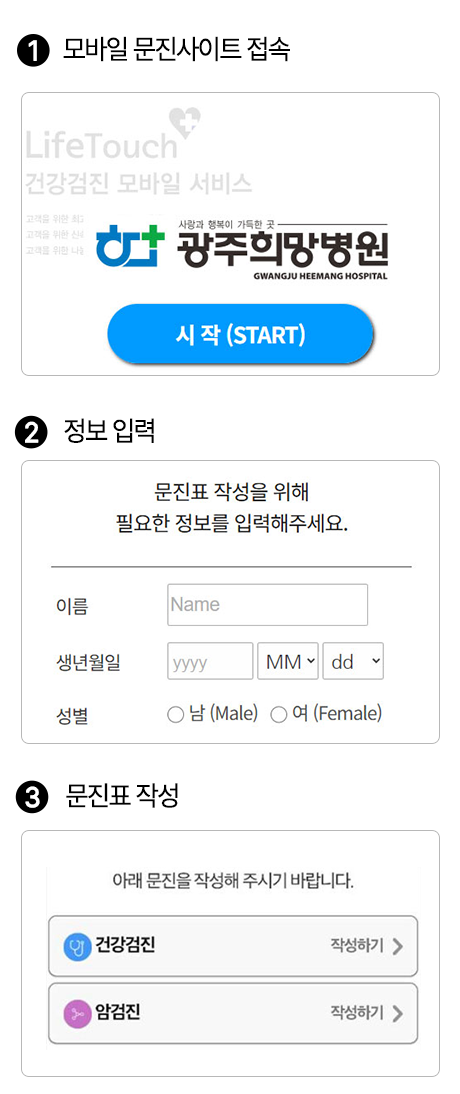 이름, 생년월일, 핸드폰번호를 정확히 입력 후 문진 작성하기 바랍니다.